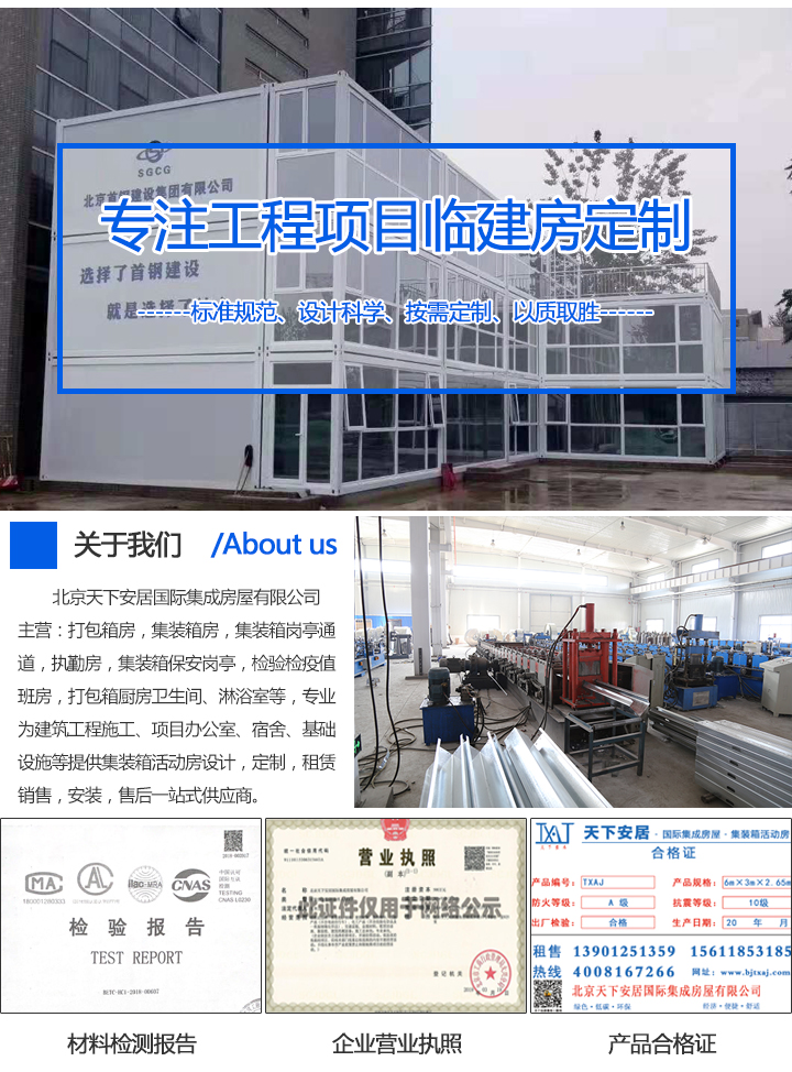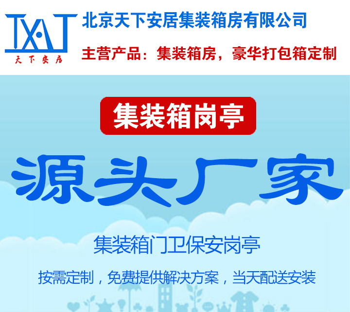 北京集裝箱式房集裝箱門(mén)禁通道定制價(jià)格8000元起,公司規(guī)模大,200個(gè)以?xún)?nèi)的箱子(包括床),3天之內(nèi)可按您的要求全部安裝完畢;押金、租金、運(yùn)費(fèi)和銷(xiāo)售價(jià)格不高于任何一個(gè)集裝箱廠(chǎng)家,因?yàn)槲覀冇幸?guī)模的優(yōu)勢(shì);具有完整的集裝箱房屋產(chǎn)品生產(chǎn)鏈體系,齊全的產(chǎn)品種類(lèi),能滿(mǎn)足不同層次客戶(hù)的需求。天下安居規(guī)模較大、實(shí)力較強(qiáng)、網(wǎng)點(diǎn)較多的特大型住人集裝箱移動(dòng)房生產(chǎn)企業(yè)集團(tuán)。